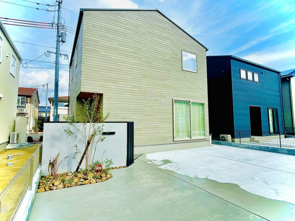正面にジョリパッド仕上げの門塀に埋め込み式ポストを設置しました。植栽との相性も抜群です。