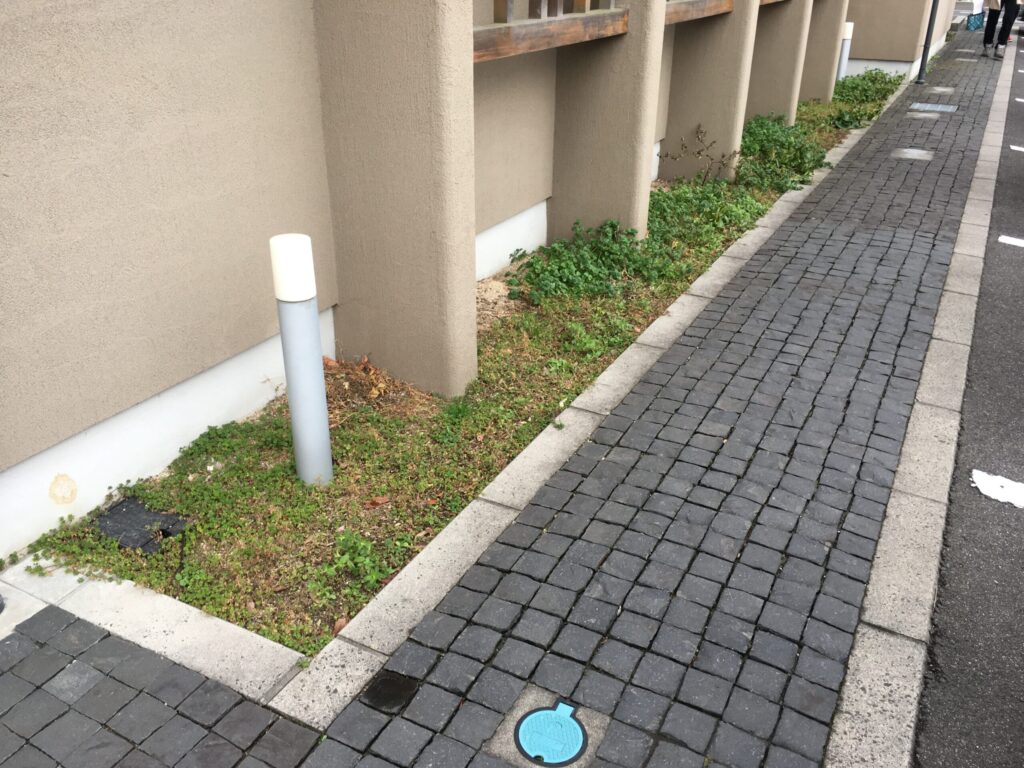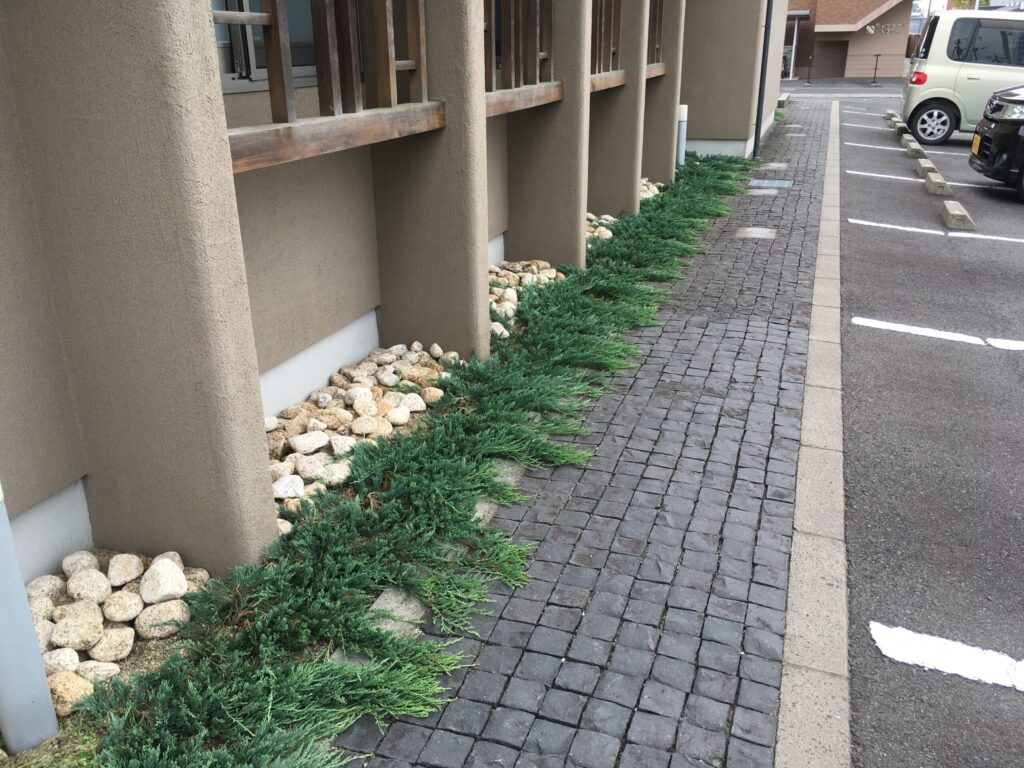 2019.07.01 限られたスペースをおしゃれにアレンジ。 最初は地被植物を全体に植えてありましたが軒下の夜露が当たらないところは育たず雑草が生えるようになってきたので、全体を鋤取り、奥はゴロタ石を敷き並べて前に緑を植えました。石と緑のコントラストがいい感じです。