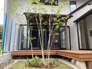 素敵なお家の設計に合うようにアオダモとモミジの寄せ植えでオシャレに演出いたしました。