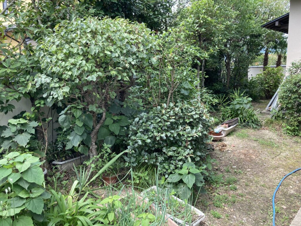 雑然とした庭の管理にお困りのお客様。なんとかすっきりとさせたいとのご希望です。