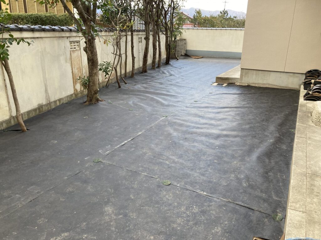 写真でもお分かりのようにきちんと隙間なく防草シートが張り付けてあります。(水勾配も計算されております)