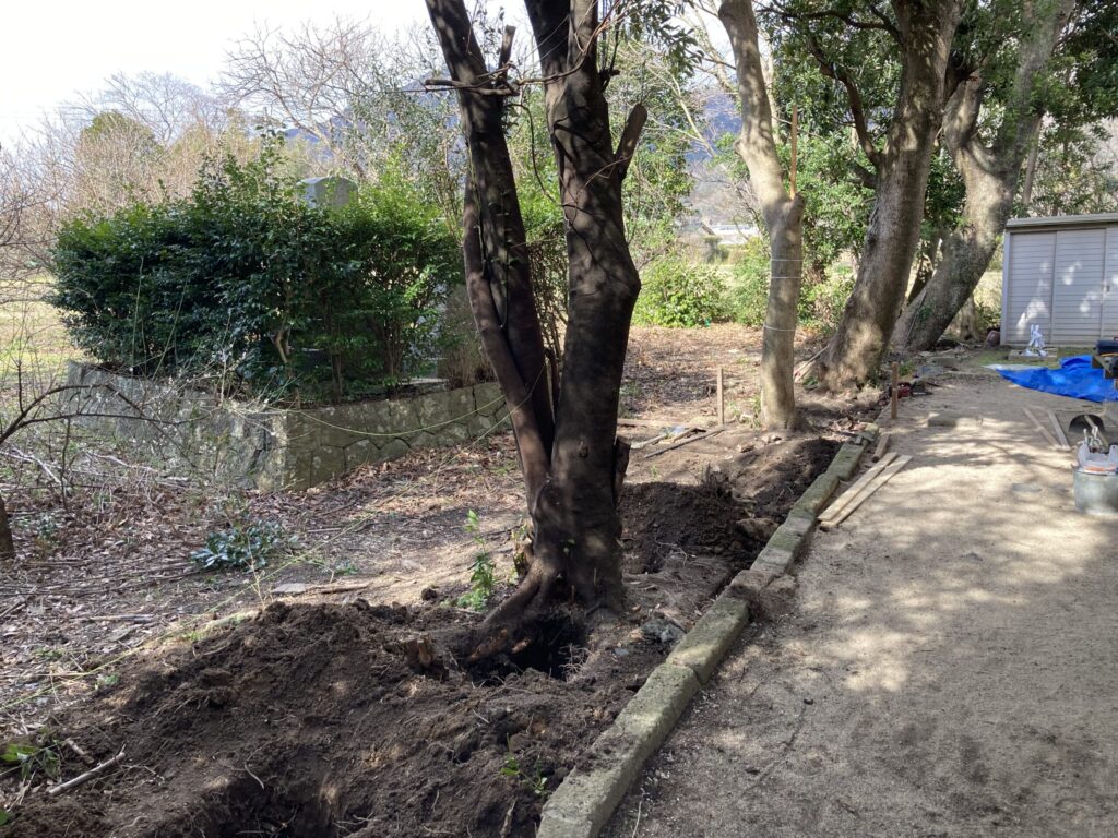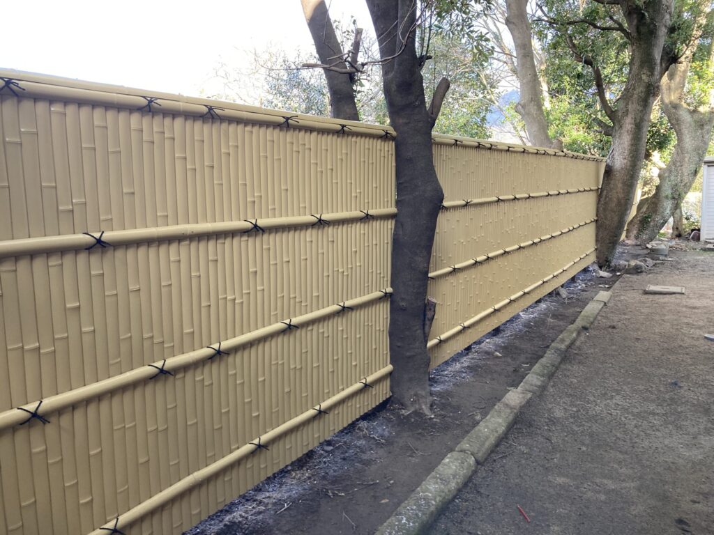 2022.03.01 目隠し・境界塀設置 境界に大径木が数本ある間にプラ竹で塀を設置しました。大径木の幹に合わせすき間がないようにするのがかなり難しいです。プラ竹のパネル自体も金額が高いので失敗は許されません!職人の高い技術が発揮されるときです。 完璧です!!