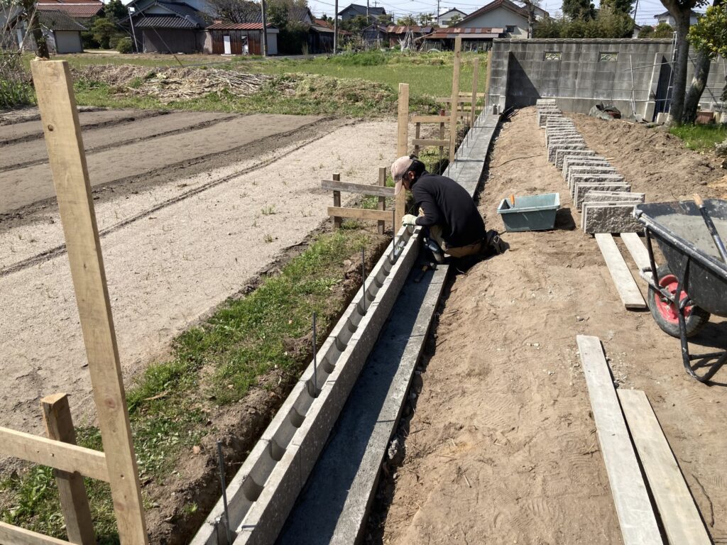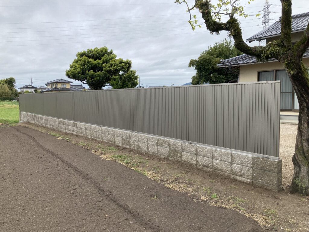 2023.04.24 目隠しフェンス縦型。 化粧ブロックに縦型のフェンスを設置しております。写真ではすき間がないように見えますが正面からは2センチくらいの隙間があるフェンスですので風も通るし結構オシャレに見える。