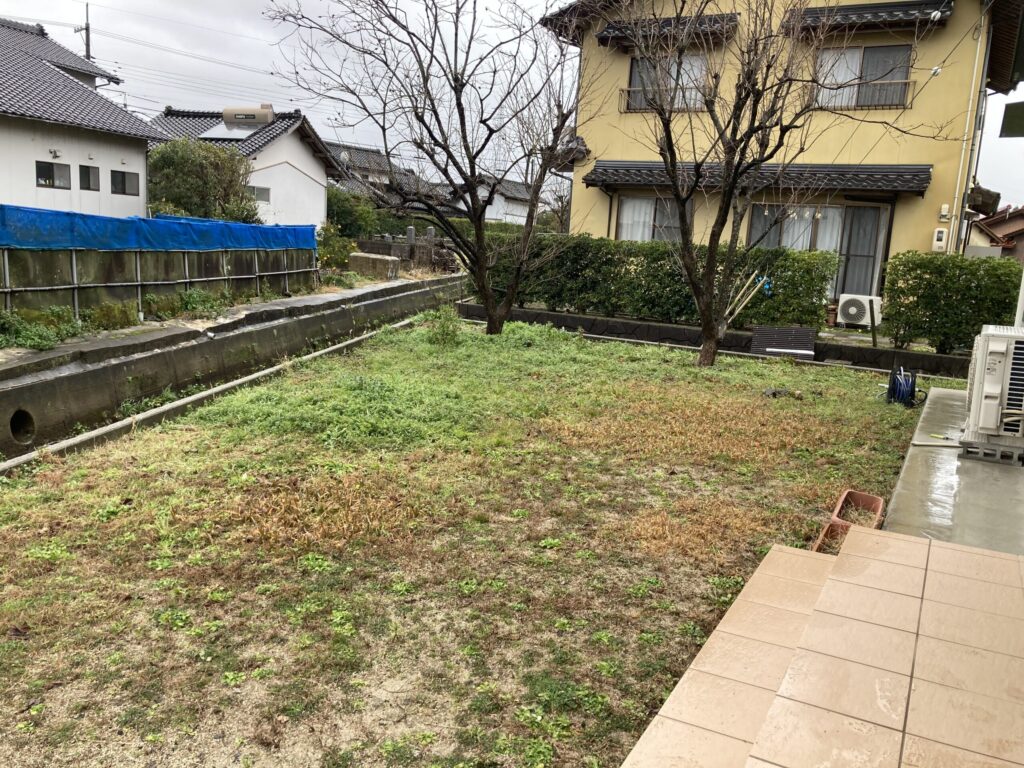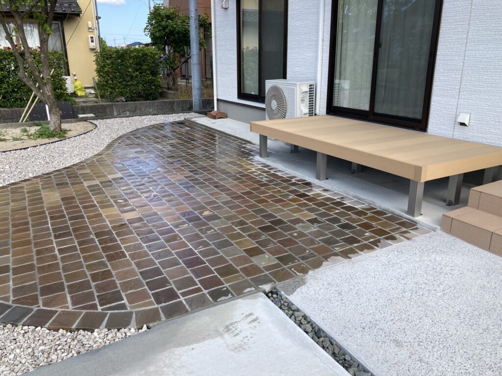 2024.09.16 アンティークの石張りテラス 雑草処理でお困りだった施主様のご希望で外でバーベキューなどを楽しんだりできるスペースの確保をテーマにデザインを考えさせていただきました。アンティークな天然石の石張り敷きです。