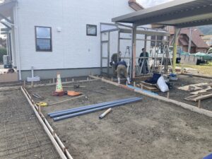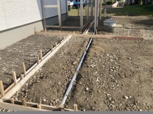 2024.09.18 物置組立てと土間コンクリートの段取り LIXILスピーネ、パネルタイプの組立中と土間コンクリートの準備中 樋から流れる雨水の垢がコンクリートに直につかないよう排水パイプを設置しています。