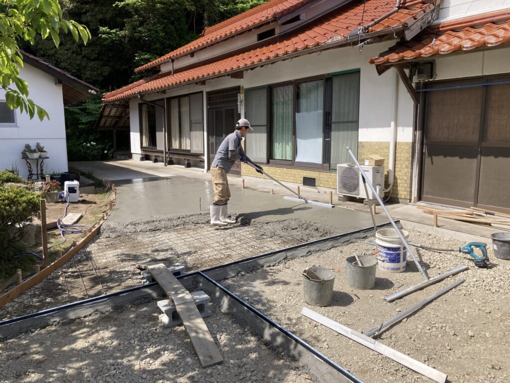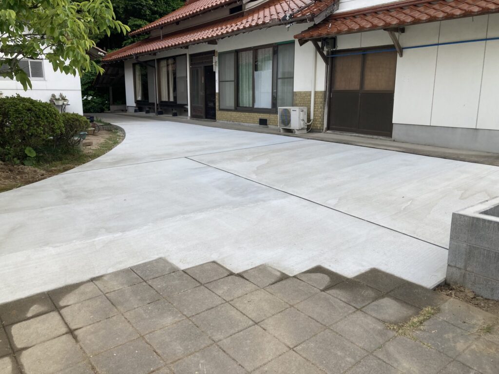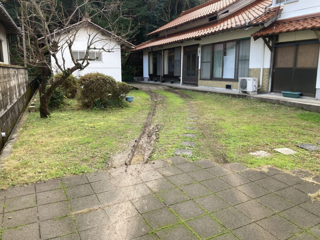 2024.11.02 ぬかるみがひどい玄関前のアプローチ 玄関前での車の乗り入れの際、雨降りなどの時には特にぬかるみがひどく、長年頭を抱えておられました。この際、駐車場も兼ねてコンクリートのアプローチにされました。