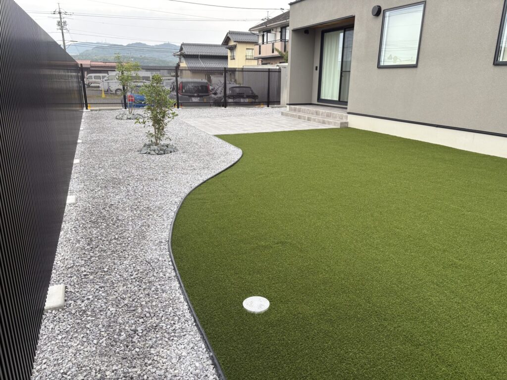広いタイルデッキと広い人工芝でご家族でバーベキューや人工芝の上で遊んだりできるスペースが欲しいということでこの広い敷地を有効活用してみました。