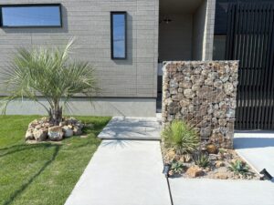 今回は流行であるガビオン門柱のある外構工事を作成しました。大きさや石の種類からこだわりました。 存在自体がおしゃれですね。